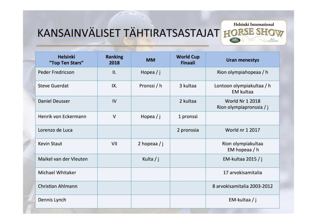 34. Helsinki International Horse Show tuo tänä vuonna Helsinkiin suuren osan maailman huippuratsastajista. Jo puolet top 10-listan ratsastajista on ilmoittautunut. Joukossa on kolme tuoretta MM-mitalistia: Ruotsin Peder Fredricsson ja Henrik von Eckermann sekä Sveitsin Steve Guerdat. Myös Helsinkiin tulevat Daniel Deusser ja ja Kevin Staut edustavat maailman ehdotonta kärkeä.