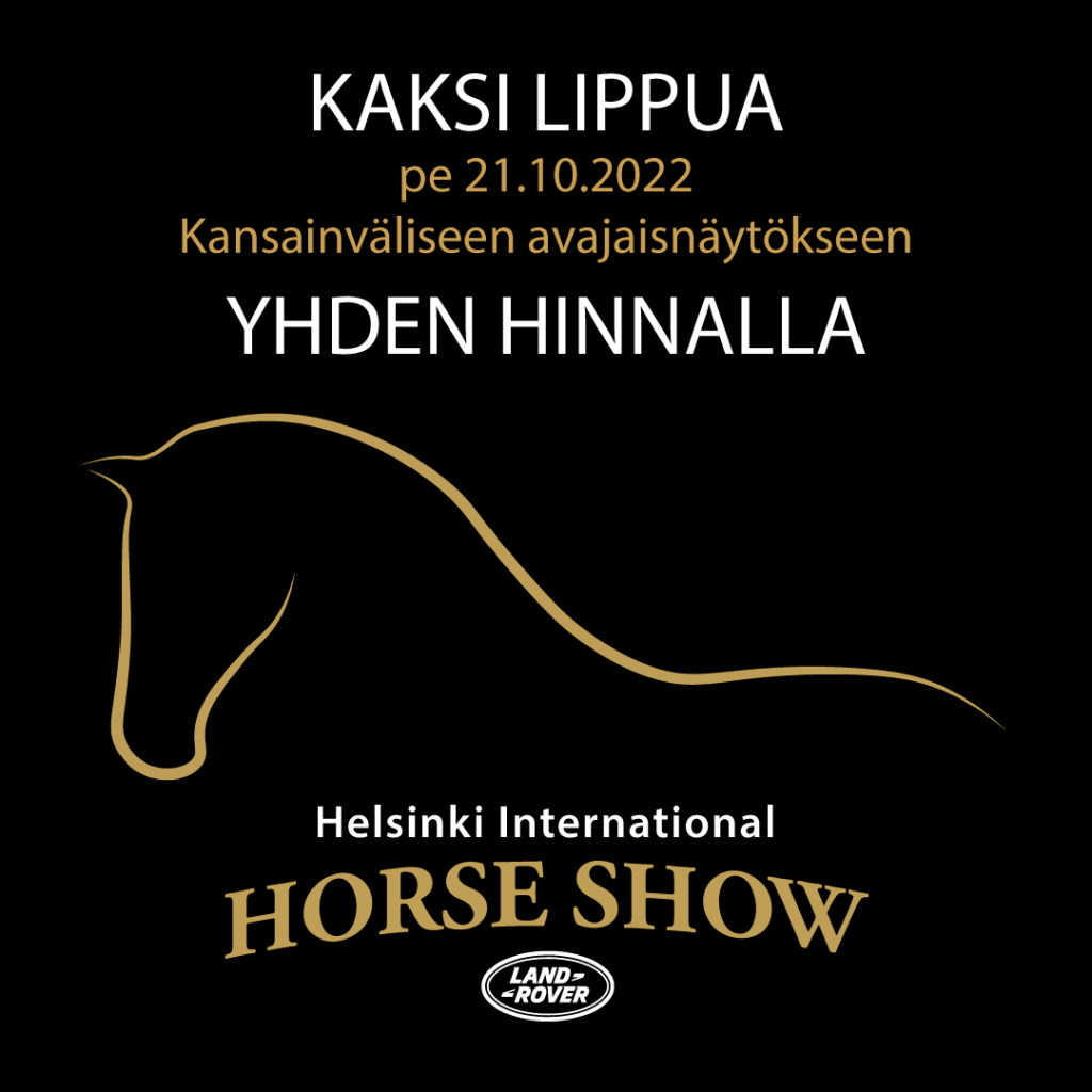 Black Fridayn huima tarjous sisältää kaksi lippua yhden hinnalla Horse Show’n perjantain 21.10.2022 Kansainväliseen Avajaisnäytökseen. Tarjouksen arvo on 79,50 €.