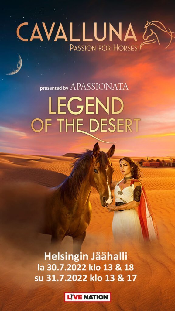 Legend of the Desert -esitys jatkaa saumattomasti Cavallunan menestystarinaa ja vie yleisön mystiselle matkalle Itämaihin. Tarinan keskiössä on Kenzie Dyslin esittämä prinsessa Samira, joka on tarkoitus kruunata kuningattareksi. Hänen häijy serkkunsa Abdul kuitenkin estää kuninkaallisen seremonian, jonka seurauksena alkaa hyvän ja pahan taistelu. Upeassa seikkailussa kauniin prinsessan on ratkaistava Amazonien mysteeri ja puolustauduttava serkkuaan vastaan luonnonvoimia hyväksikäyttäen. Pelissä on prinsessa Samiran kansan ja koko maan turvallisuus. Legend of the Desert vetoaa koko perheeseen. Katso esimakua esityksestä täältä.