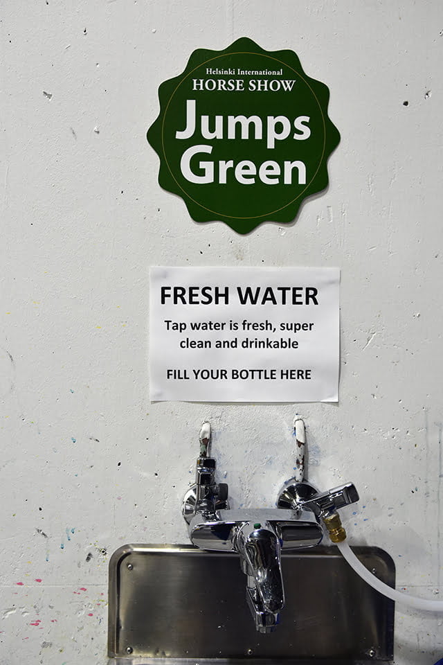 Pullotetun veden käyttöä vähennettiin jakamalla kansainvälisille ratsastajille ja toimihenkilöille täytettävät juomapullot. Myös yleisö omalta osaltaan osallistui kiitettävästi pullotetun veden käytön vähentämiseen.