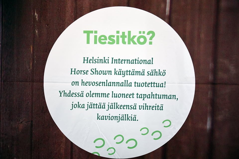 Viime vuoden tapaan kaikki tapahtuman aikainen energia tuotettiin hevosenlannalla. Tänä vuonna 235 talleihin majoittunutta hevosta tuotti yhteensä 112 tonnia lantaa. Lannasta saatiin 168 MWh energiaa.  Helsinki Horse Show tapahtumana käytti kokonaisuudessaan 132 MWh energiaa. Ylijäänyt 36 MWh riittää mm. lämmittämään 36 pientä asuntoa kuukauden ajan tai antamaan energiaa sähköautolle 288 000 kilometrin ajoille.