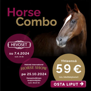 Horse Combo liput ostetaan Ticketmasterin Hevoset messujen sunnuntai 7.4. sivuilta. Hevoset-messujen lipun saat välittömästi oston jälkeen ja huhtikuun aikana Ticketmaster lähettää sinulle linkin Horse Show 25.10. pe avajaisnäytöksen lunastamista varten.