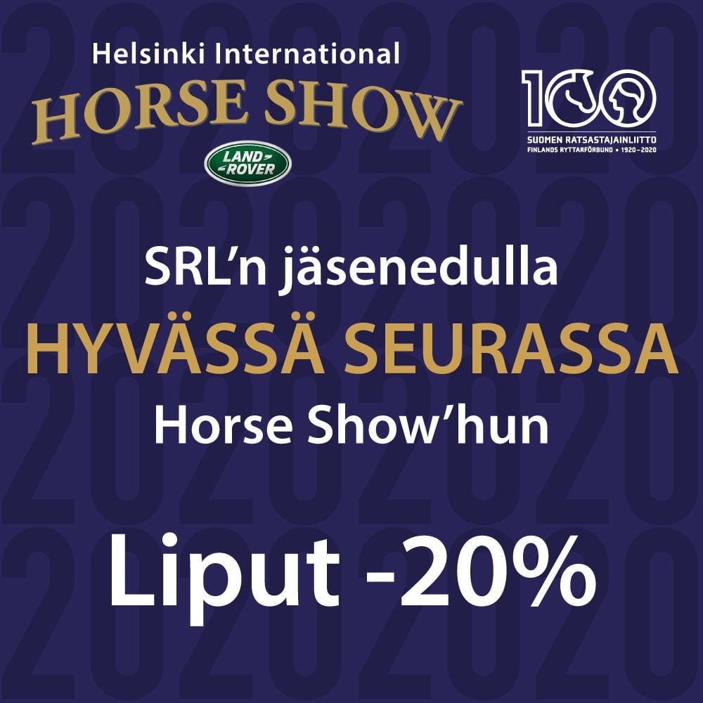 Suomen Ratsastajainliiton ja Helsinki International Horse Show’n yhdessä toteuttama Hyvässä Seurassa jäsenetu mahdollistaa Horse Show -elämyksen huomattavan edullisin lippuhinnoin – 20 % alennuksella. Alennus koskee kaikkia viikonlopun näytöksiä perjantaista sunnuntaihin. Minimitilaus on 8 lippua. Jäsenedun myynti käynnistyy elokuussa ja tilaaminen on vaivatonta sähköisen tilauslomakkeen kautta. Lue lisää jäsenedusta täältä ja aloita ihanan syysretken suunnittelu jo nyt.