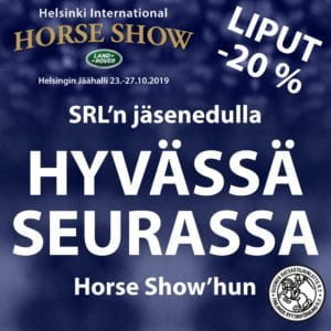 Suomen Ratsastajainliiton ja Helsinki International Horse Show’n yhdessä toteuttama Hyvässä Seurassa jäsenetu saa jatkoa tänä vuonna. Jäsenetu mahdollistaa Horse Show -elämyksen edullisin lippuhinnoin, – 20 % alennuksella. Kokoa vähintään 10 hengen porukka kasaan, tilaa liput 26.8. – 13.10. välisenä aikana ja lähde nauttimaan huippuratsastuksesta Helsingin Jäähallille lokakuussa. Jäsenetu sisältää myös muita huikeita etuja.
