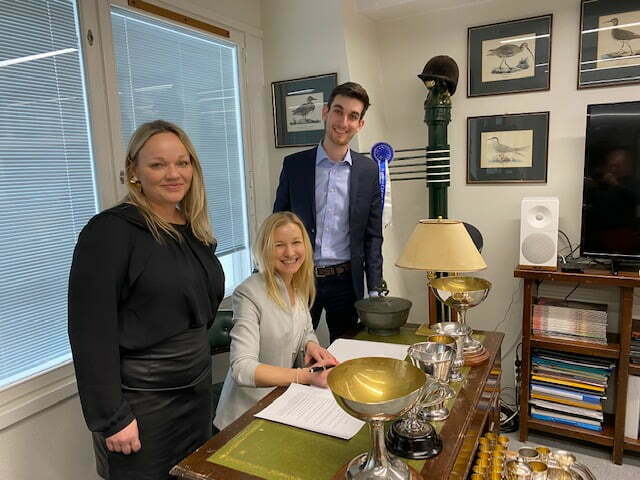 WHG:n Mona Wendelin, Lotta Häyrinen ja Giacomo Gangini allekirjoitustilaisuudessa
